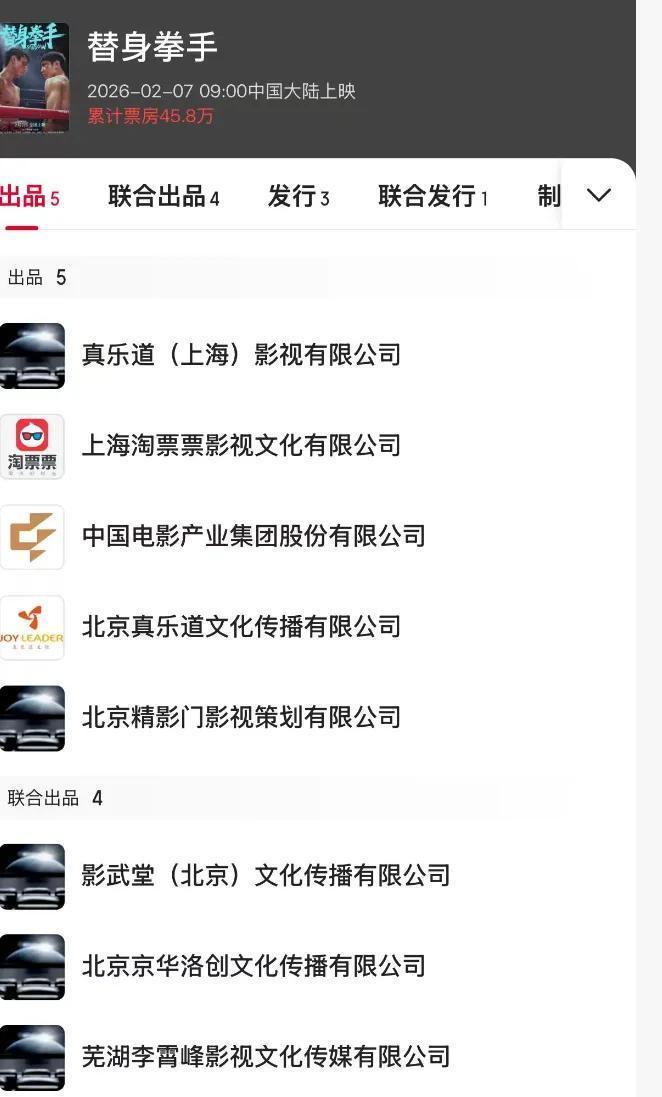 更惨的是那部上映快一周的《替身拳手》,简直扑得悄无声息。这片子配置可不低,阿如那、马伯骞两个年轻面孔,加上胡军、王耀庆这些老戏骨,还有李雪琴助阵,幕后的阵仗更大——徐峥亲自监制,他和陶虹的“真乐道”公司领衔出品,连吴京的“影武堂”(背后是他的登峰国际)都投了钱。结果呢?首日排片只有1.3%,五千多场放映,票房才15万。七天过去,总票房刚爬到45万出头,片方分账估计就十来万,血亏没跑了。